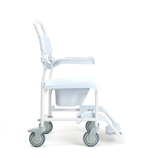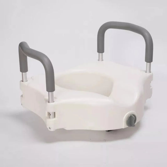 مقعد مرحاض أبيض مرتفع مع مساند ذراع مبطنة قابلة للإزالة